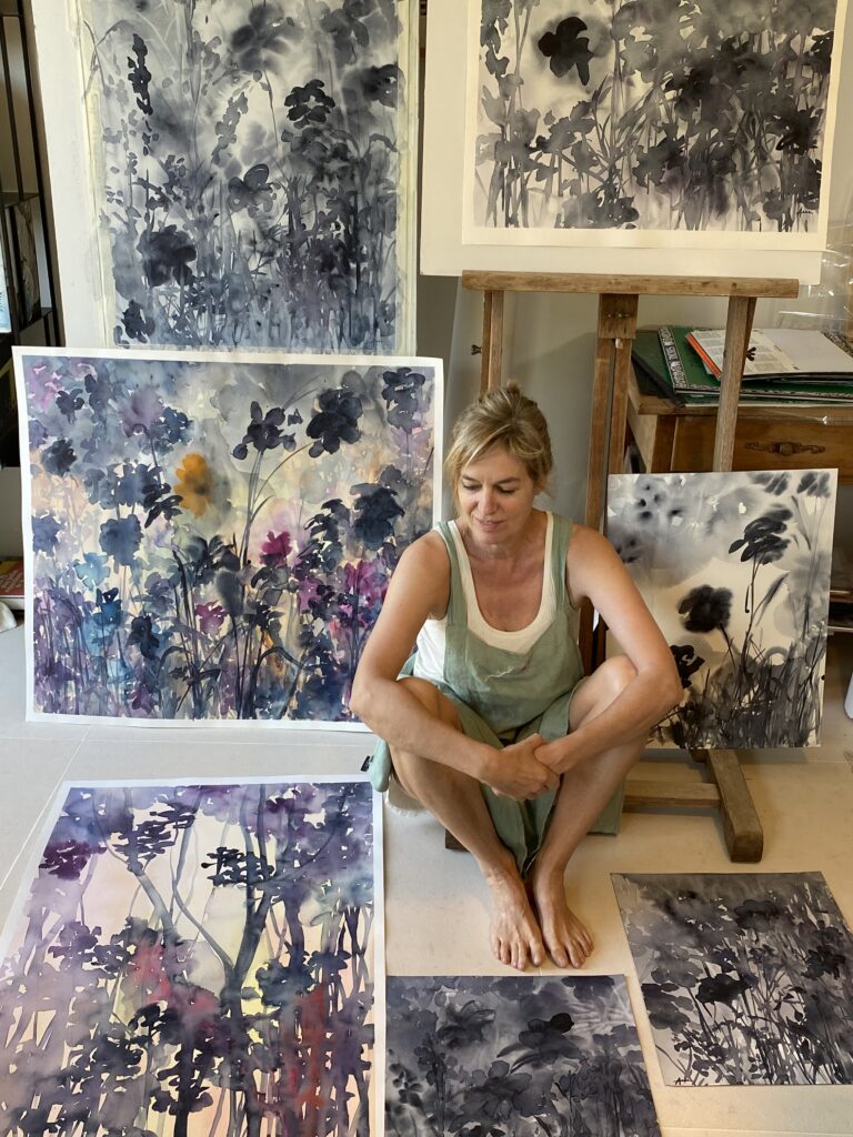 Dans son atelier de Giens, l’artiste réinvente des paysages, ces mondes miniatures sont d’abord l’expression de son intériorité. Sur toile ou sur papier, ces espaces mentaux se confrontent. Ses arbres ont des silhouettes humaines, tels des personnages sensuels ou énigmatiques. Le geste est intuitif, l’artiste bouscule les codes de l’aquarelle, ici la couleur fait surgir le dessin dans une liberté totale. Dans ses Musicales, ou paysages rythmiques, l’encre de Chine blanche vient dynamiter les volutes de pigment avec une énergie farouche.